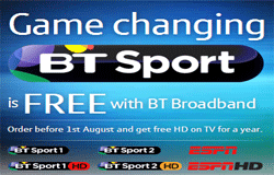 BT Sport comes free with BT Broadband. Get HD on TV also for free for a year when you order before August 1st 2013. With BT Sport you can enjoy 38 Barclays Premier League football matches, 69 live Aviva Premiership rugby matches and 30 live Scottish Premier League matches.